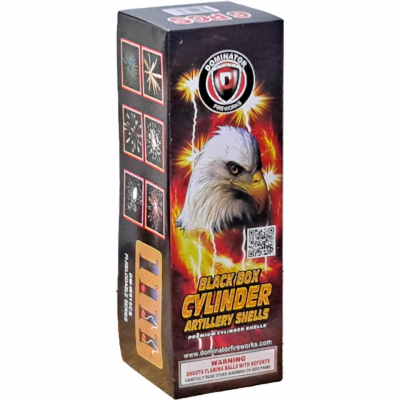 Dominator Fireworks brand premium cylinder artillery shells in a compact black box. Each kit contains classic fun with 6 cylinder style fireworks shells and a mortar launch tube.