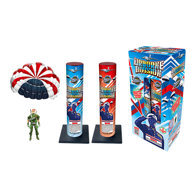 Classic R, W, B parachute with hanging soldier and red/blue smoke in this single aerial tube. Daytime use only. Really spectacular!